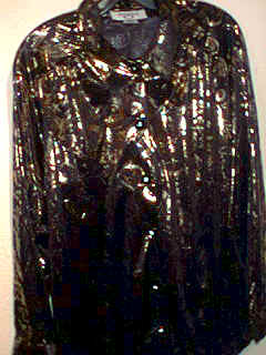 Cervelle Scroll Print Lame Shirt. Made in the USA! 100% polyester. This beautiful shirt is long sleeve. It has a gold leaf pattern through out on a black background. Buttons on the cuffs and up the front are black with a faux diamond on each. Feels like silk! Very stunning! Only $14.95 + $3.55 s&h. available in small & Medium.