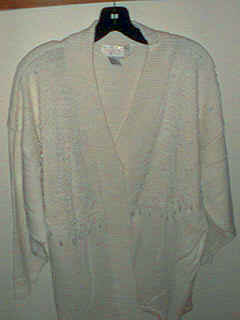 Maurada Knit Decorated Sweater. White with lots of faux pearl decorations on the front. Open sweater design. No buttons. Made of 55% Ramie and 45% cotton. Color is white, size is 3X. $29.95 + $4.80 s&h.