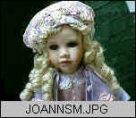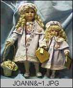 Meet Joann & Larissa who are sisters. They have been nominated for a 1999 excellence award. They are two beautiful porcelain dolls. Both are elegantly dressed in lavender coats trimmed in rosebuds and adorned with pink pearlized collars. Underneath the coats they are wearing pink dresses decorated with lilac roses. Joann's hat is decorated with rose buds & pearls. Larriss's is decorated with lilac roses and small pink pearls. both are wearing white leather shoes with lilac flower buds. Joann is carrying a basket of roses. Larissa is carrying her own rose bouquet. Their eyes are blue-gray. Their legs are porcelain to up above their knees. They are porcelain to mid arms. Both have poseable necks. You can own these beautiful sisters for only $249.95 Katie Mini-Porcelain Doll