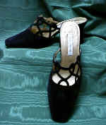 The accent is on the heels of these shoes. There are three sleek gold tone leopards strutting there stuff. The heels are 1 3/4" high. These black suede shoes are soft. Only 1 pair left!