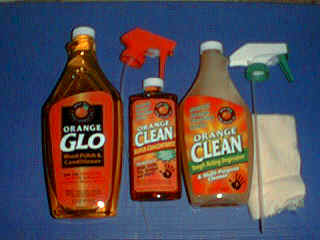 Orange Glo and Orange Clean are great for cleaning, polishing and conditioning wood. Orange Gloss restores the original luster to wood surfaces. It effectively removes wax buildup. if you have a beeswax finish, Orange Glo will remove this as part of its cleaning mission. Orange Glo Wood Polish & Conditioner and Orange Clean are made with natural orange oil from the peels of oranges. Orange oil is a powerful, natural cleaning agent that makes these excellent cleaners! Orange Glo is a cleaner and polish for use on wood and other hard surfaces. Orange Glo will clean , moisturize and protect the finish on your kitchen cabinets, Formica counters, table tops and much, much more. Leaves your home smelling like fresh oranges! $12.95 |