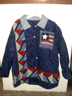 Hand Crafted Quilted Jacket. This jacket is called "Old Glory". It is hand stitched by C&T Enterprises. The Jacket is Reversible! It has a 100% cotton shell and a 100% polyester fill. Button up front. Sizes are large and medium. $39.95 |