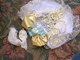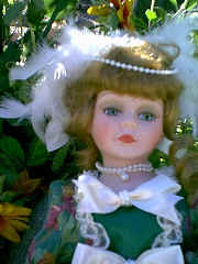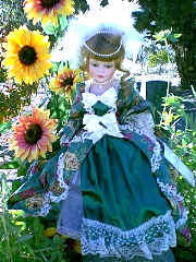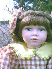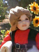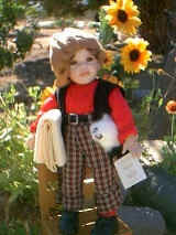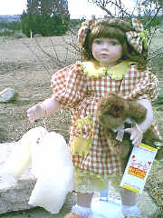 This adorable doll is Honey Bee. She has her best friend "teddy" in her arms. Honey is porcelain. She has a porcelain had, arms to her elbows, legs to her knees. Her body is cloth. She is dressed in the cutest outfit. Her dress is checks and she has trim of little flowers on the collar. Her friend teddy has little bees. She 19" tall, and comes with a stand. Her eyes are green and her hair is light brown. She is numbered 12/2000. $59.95, shipping $9.95 Eddie and Fred